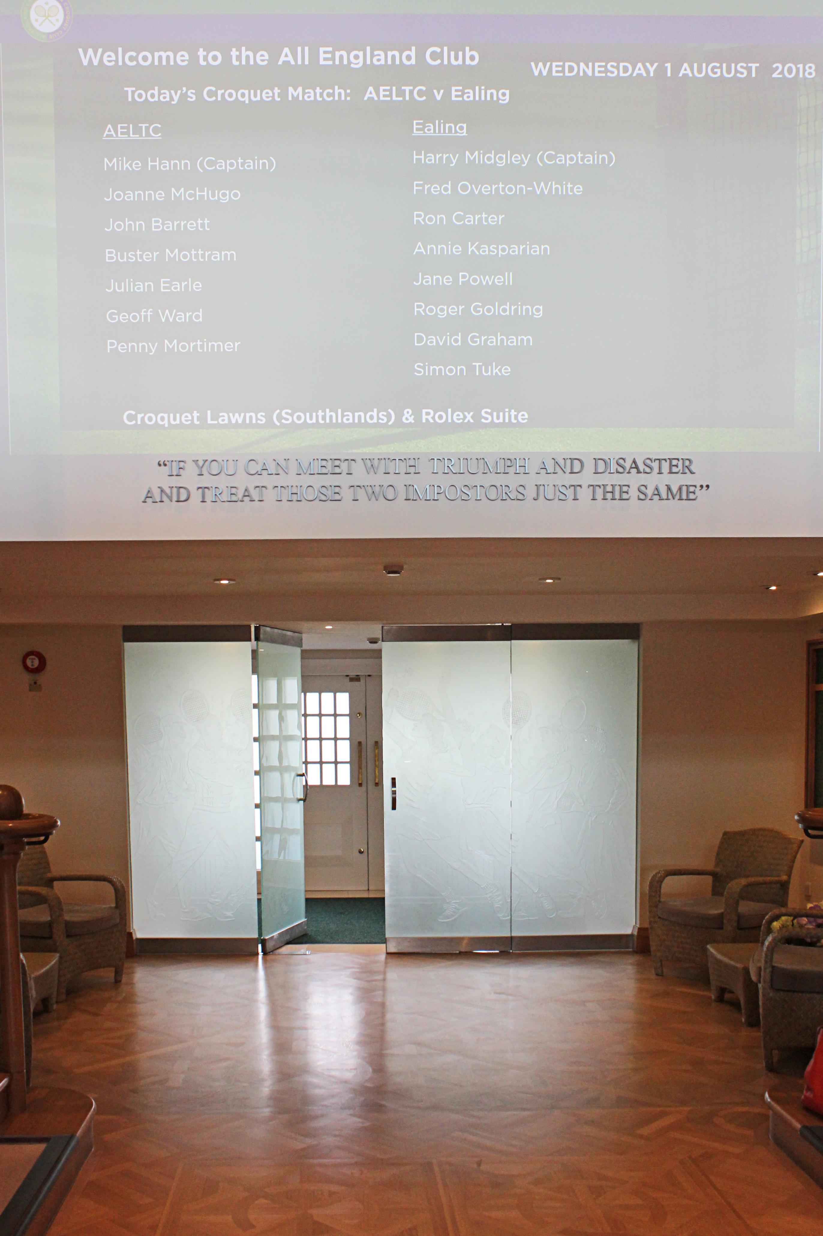 We were treated to lavish hospitality in the Rolex Suite, and were given a fascinating guided tour by Buster Mottram, including visiting the Royal Box, seeing the Championship trophies, and discovering that the record for most wins at Wimbledon is held not by Martina Navratilova, but by croquet player Bernard Neal.
