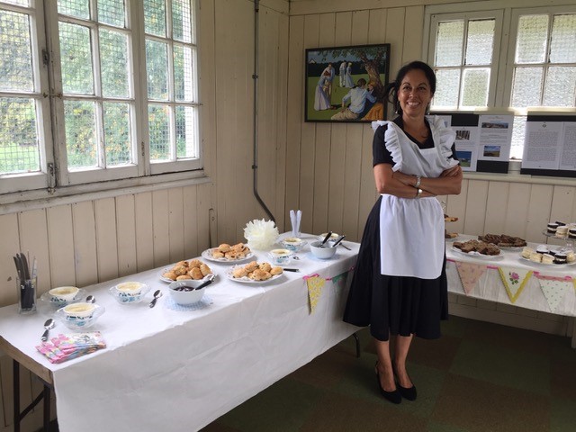 New member Susan Stephenson (resplendent in Alice in Wonderland pinny – see photo) was the Organiser Extraordinaire. The upstairs of the pavilion was transformed with bunting and flowers, and tables groaning with food.