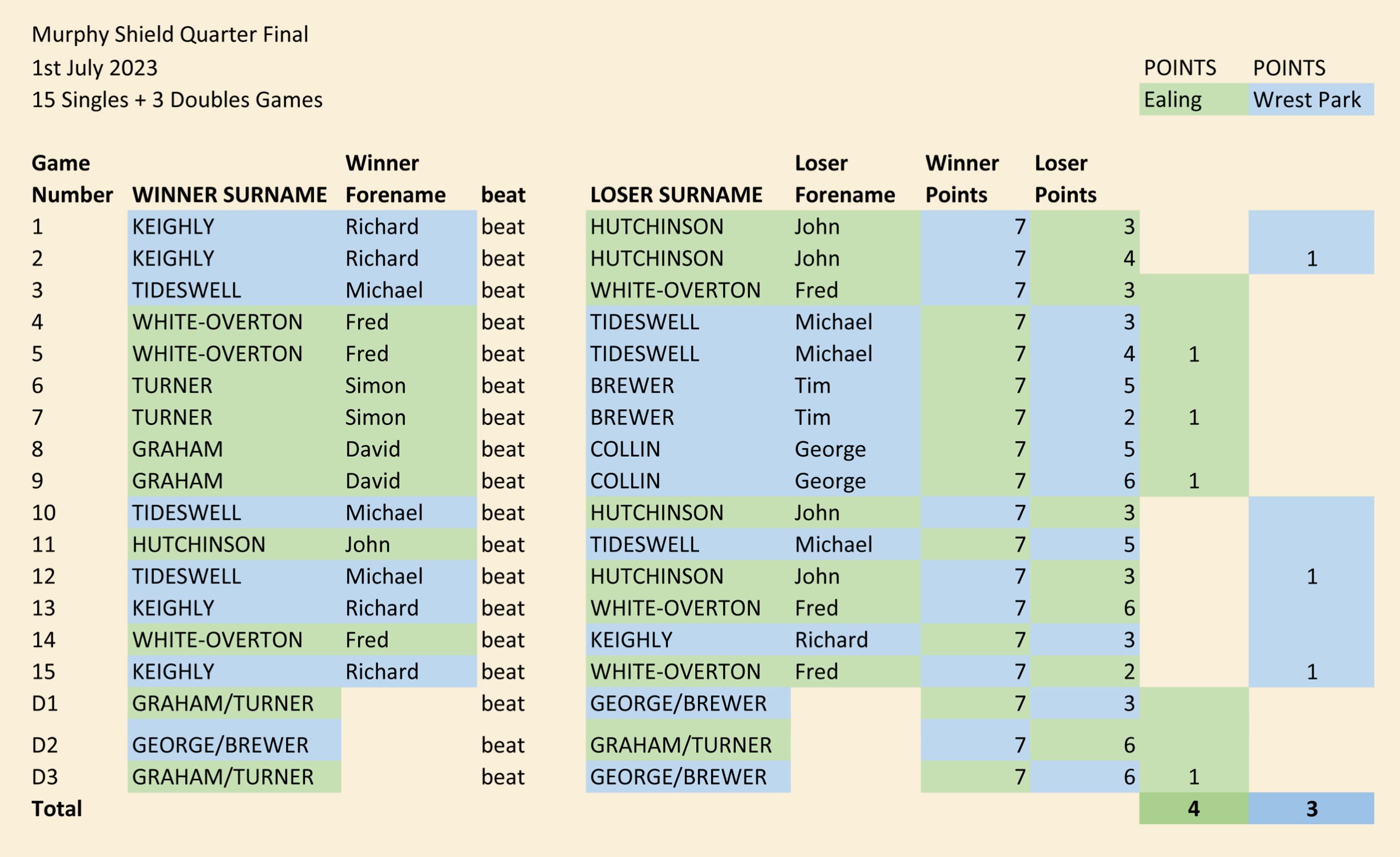 Ealing won the first of the afternoon singles matches to make it 3-1 to Ealing with one more match needed for a home win. The second match went to Wrest Park but Ealing’s 10 handicap newcomer, John Hutchinson, gave a spirited performance, losing in 3 games. The tie was eventually sealed when Ealing’s No 1 player beat his Wrest Park Counterpart in game 2. Simon Turner also beat his opponent in 2 games, while the final match went to Wrest Park to make it 4-3 overall, with Ealing progressing to the semi-final.