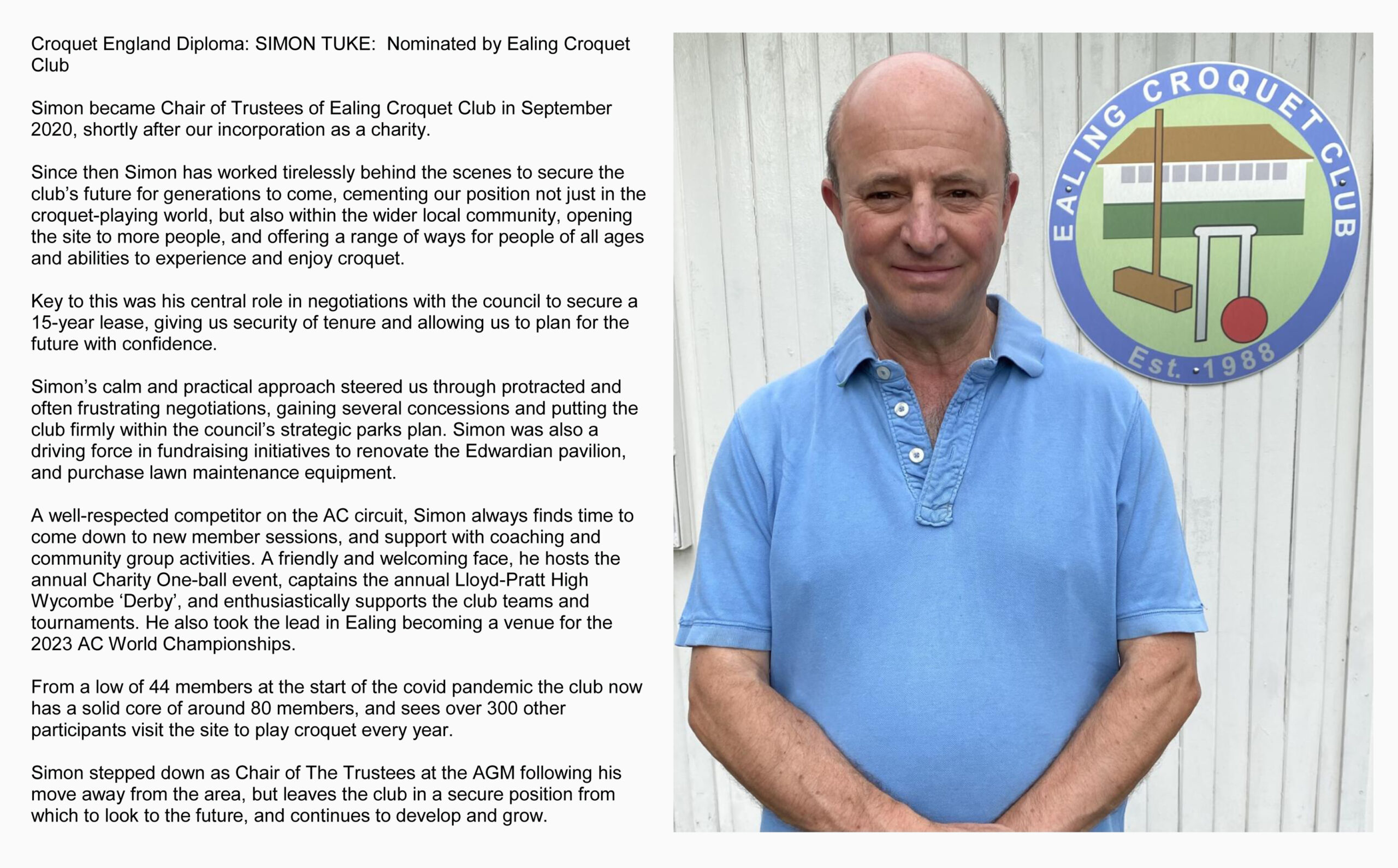 Simon Tuke has been awarded a Croquet England Diploma in recognition of his services to Ealing Croquet Club, presented at the club AGM.